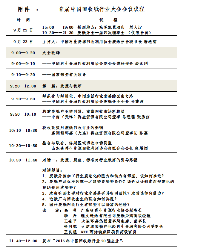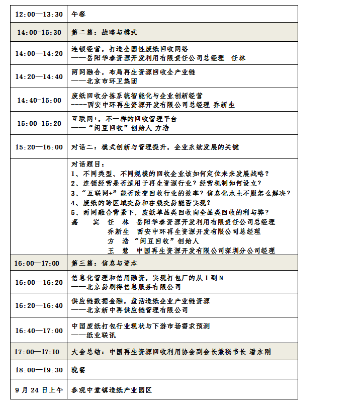 為了破解企業(yè)經(jīng)營困局,引導(dǎo)廢紙回收加工行業(yè)規(guī)范發(fā)展,構(gòu)建有序競爭的市場環(huán)境,中國再生資源回收利用協(xié)會定于2016年9月22日-24日在廣東省東莞市中堂鎮(zhèn)召開首屆中國回收紙行業(yè)大會,聚焦回收行業(yè)規(guī)范與整合,分享創(chuàng)新的經(jīng)營模式和企業(yè)戰(zhàn)略,剖析產(chǎn)業(yè)政策著力點(diǎn),在行業(yè)前行關(guān)鍵節(jié)點(diǎn)共謀發(fā)展之路。