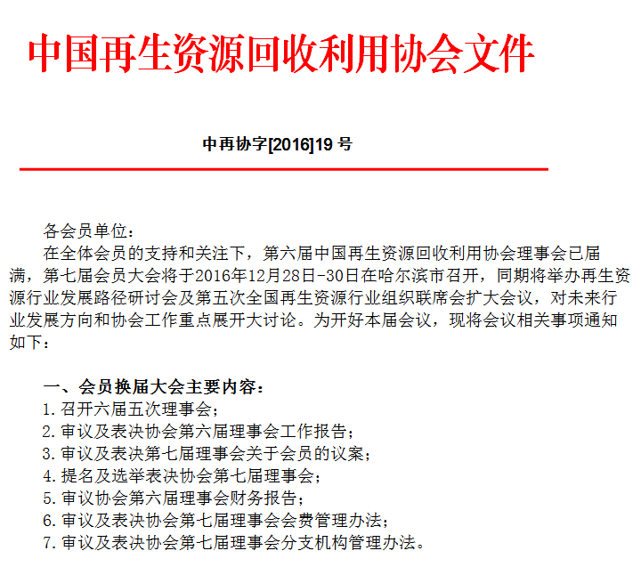 關(guān)于召開中國(guó)再生資源回收利用協(xié)會(huì)第七屆會(huì)員大會(huì)暨再生資源行業(yè)發(fā)展路徑研討會(huì)通知
